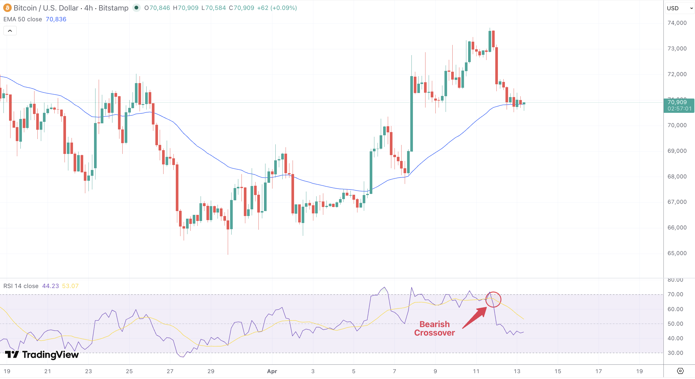 No RSI de 4 horas, a leitura atual de 41,65 está abaixo da linha de sinal de 52,88, confirmando um cruzamento de baixa que coloca o momentum firmemente em território negativo. Essa configuração é consistente com um mercado que reverteu de condições de sobrecompra e agora está testando se os compradores têm convicção suficiente para defender a faixa de $70.000 a $71.000. O RSI diário, de acordo com dados agregados de indicadores disponíveis em 13 de abril, está na faixa de 41 a 42, corroborando ainda mais o viés de baixa de curto prazo. No MACD, a leitura diária de aproximadamente -373 com um sinal de venda nas amplitudes de 5 horas e horária sugere que o momentum de queda ainda não se esgotou.
