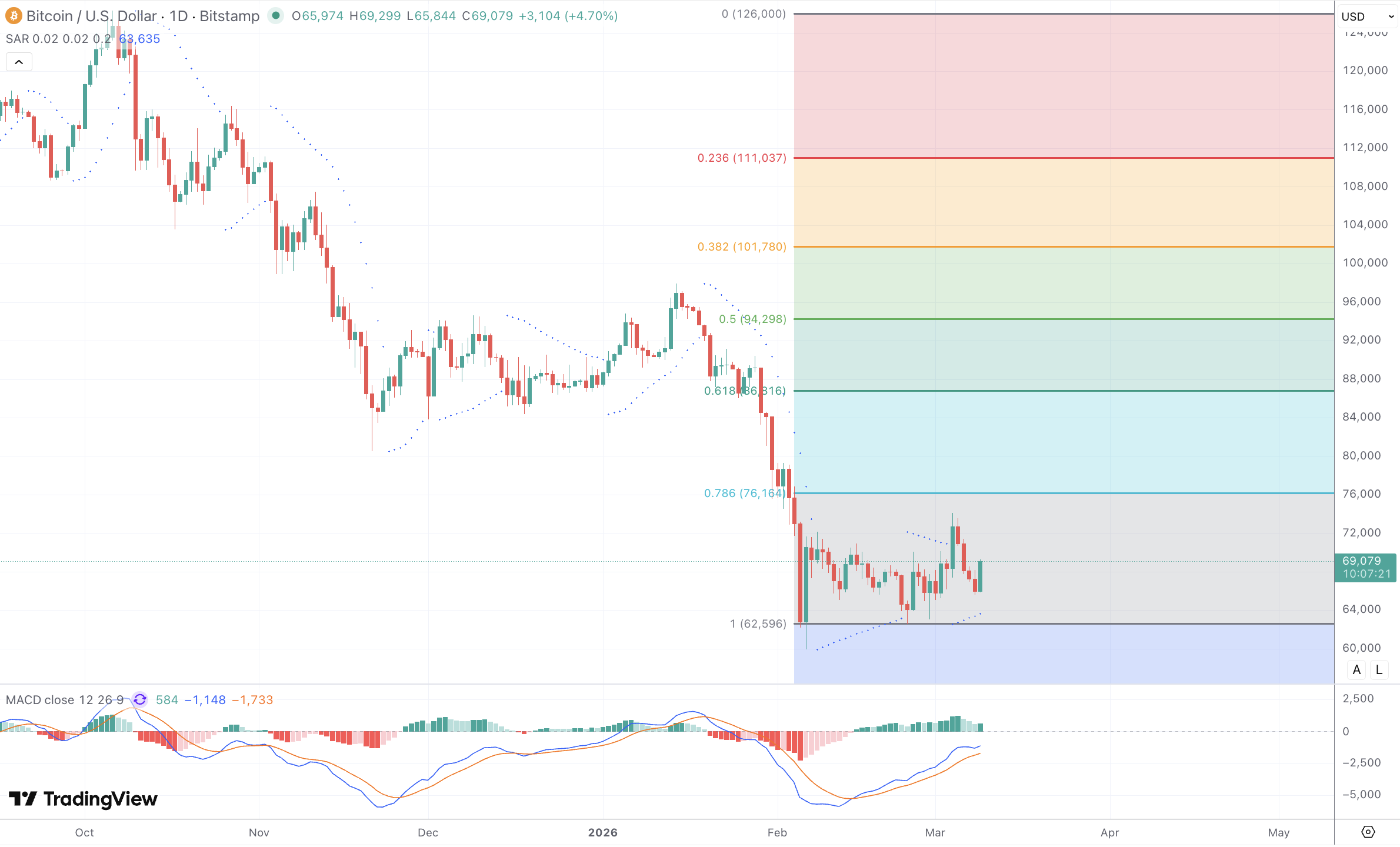 La cuadrícula de retroceso de Fibonacci trazada desde el máximo histórico de $126.000 hasta el mínimo del ciclo de $62.596 cuenta una historia aleccionadora sobre lo lejos que ha llegado la corrección. El precio actual cerca de $67,966 está cotizando entre el retroceso de 0.786 en $76,168 y el nivel completo de 1.0 en $62,596, lo que significa que Bitcoin ha retrocedido más de 78.6% de toda su carrera alcista anterior. Los objetivos inmediatos de recuperación al alza son el nivel de 0,786 en $76.168, seguido por el 0,618 en $86.816, el punto medio de 0,5 en $94.298, y el 0,382 en $101.780. Cada uno de estos niveles representa una sobrecompra significativa. Cada uno de estos niveles representa un obstáculo importante y una probable zona de oferta. El Parabolic SAR se encuentra actualmente en 62,758, por debajo del precio actual, lo que es una señal alcista en el marco de tiempo diario, lo que indica que la tendencia a corto plazo ha cambiado a favor de los compradores. Se trata de un cambio significativo con respecto a la configuración anterior del SAR bajista y respalda el intento de recuperación a corto plazo. El ADX cercano a 25 refleja una fortaleza de la tendencia moderada en lugar de extrema, en consonancia con la consolidación distributiva, y el ATR sigue siendo elevado, lo que apunta a una volatilidad intradía continuada.