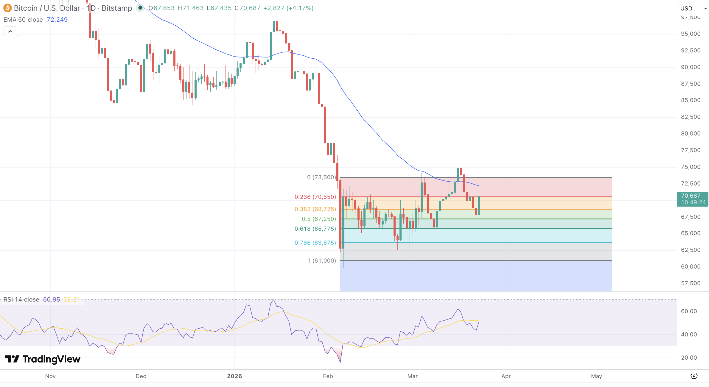 - BTC/USD cotiza en torno a $70,303 el 23 de marzo, subiendo 3,6% en la sesión, con un máximo intradía de $71,463 y una larga mecha superior que señala una resistencia activa en el grupo de $71,300 a $73,300.