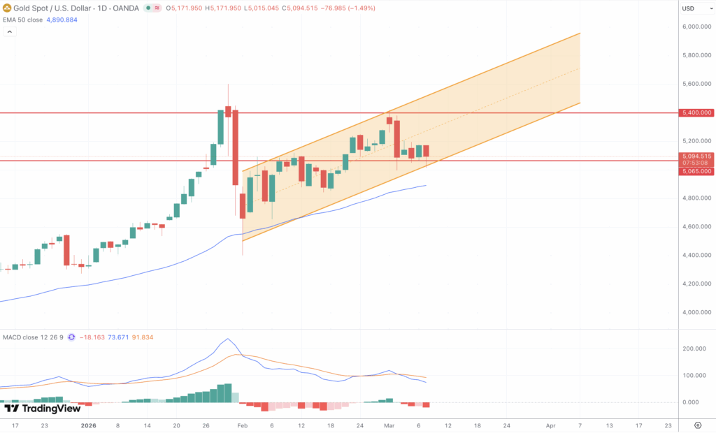 El oro cotiza dentro de un canal ascendente bien definido en el gráfico diario, con el límite superior cerca de $5.400 sirviendo como zona de rechazo durante el pico de Irán y el soporte del canal entre $5.065 y $5.080. Una ruptura por debajo de ese suelo expone el nivel psicológico de $5.000, por debajo del cual la EMA de 50 días cerca de $4.883 se convierte en la siguiente referencia estructural clave. La media móvil de 5 días, en $5.157, se sitúa ligeramente por encima, y la SMA de 200 días, en $4.232, confirma que la tendencia alcista dominante a largo plazo sigue intacta.